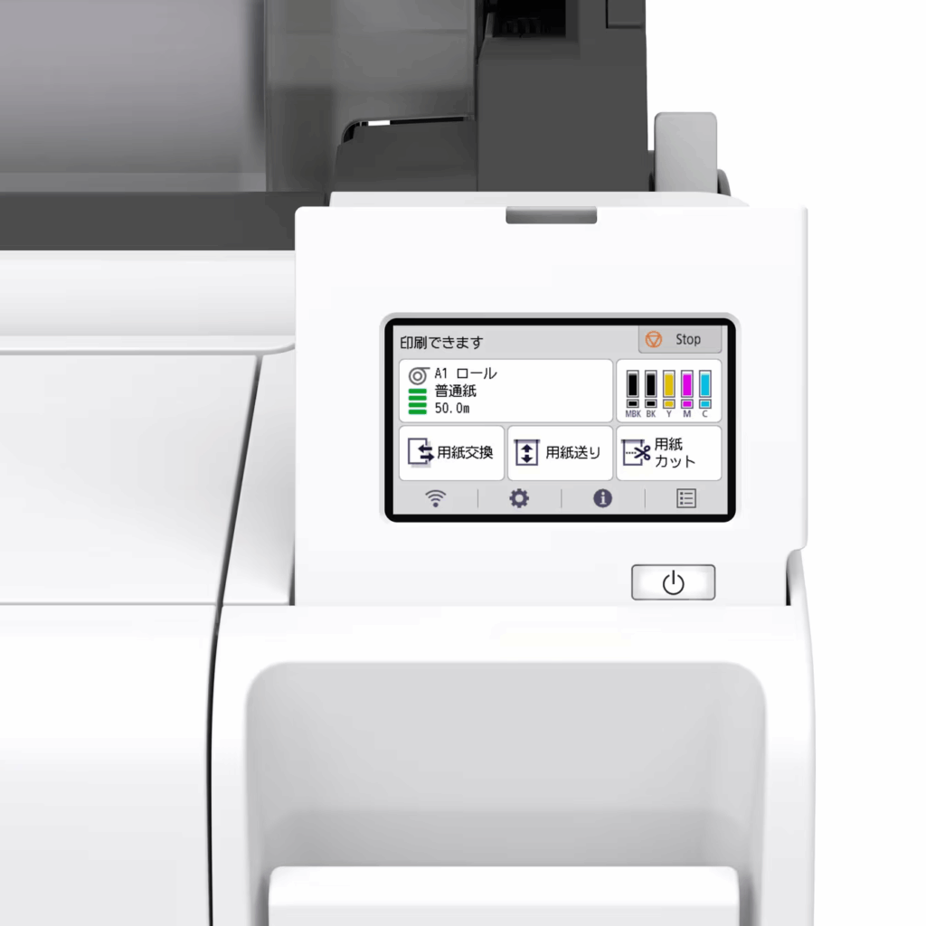 Design funzionale con pannello touch screen da 4,3″ che visualizza istruzioni intuitive e informazioni importanti come il tipo di supporto e la quantità di supporto e inchiostro rimanente. Il rotolo di carta può essere sostituito con facilità attraverso il coperchio piatto.